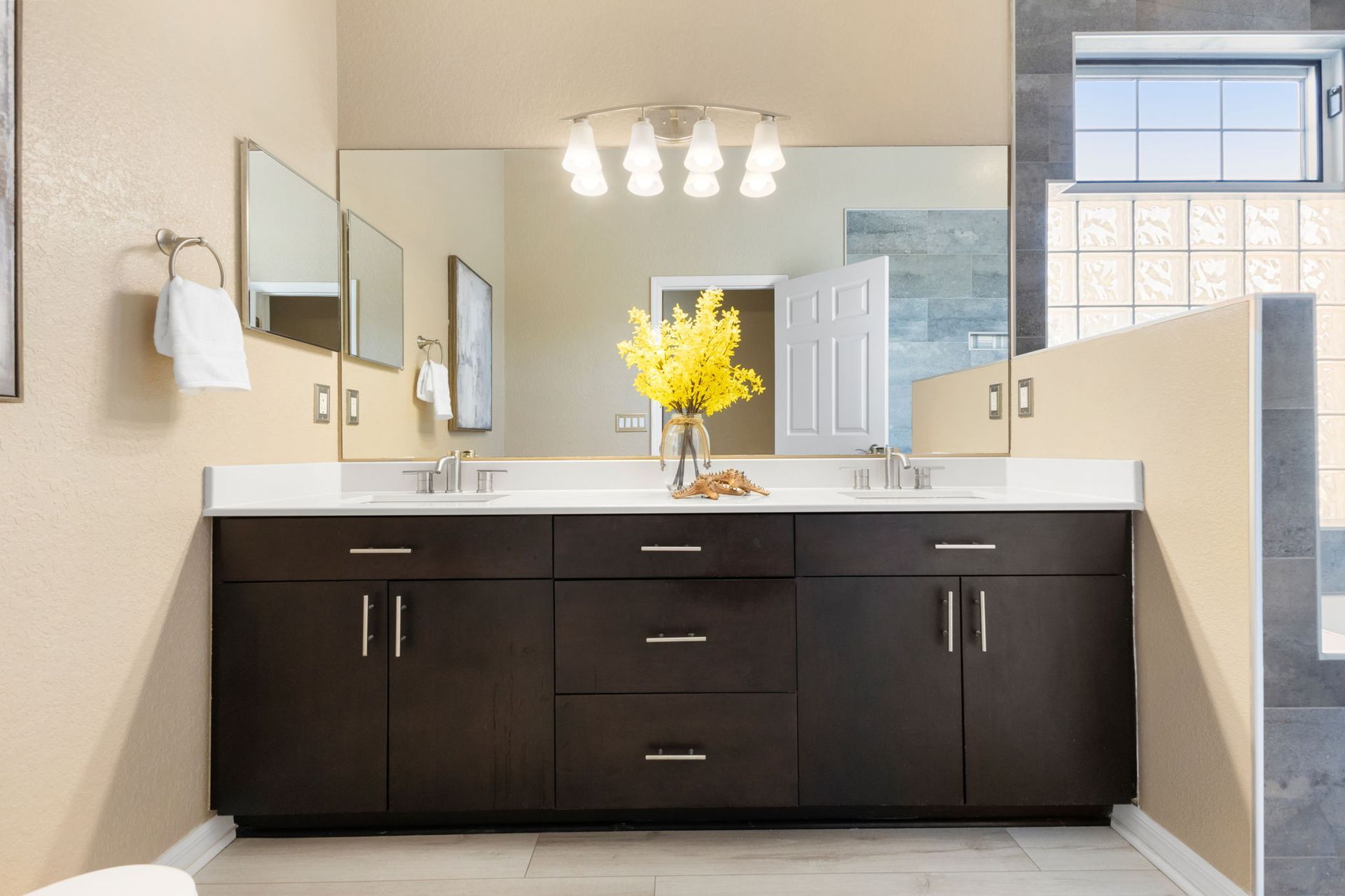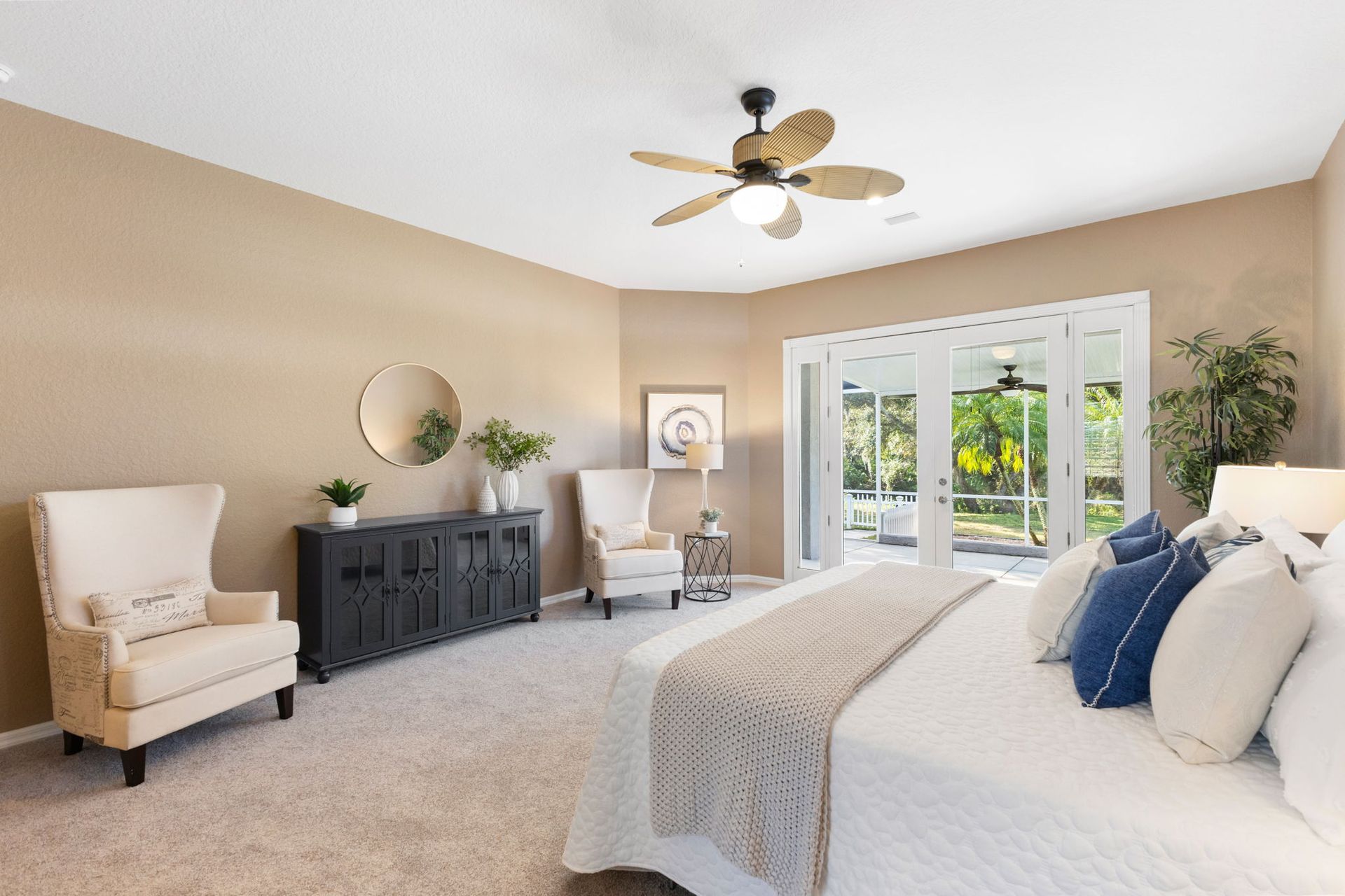 The true split floor plan offers generously sized secondary bedrooms with brand-new carpet and spacious closets featuring premium adjustable shelving. The second bathroom was beautifully renovated in 2024 and showcases a stunning tub and walk-in shower combo with tasteful tilework. The oversized primary suite offers new carpet and French doors that open to your private screened-in back patio—perfect for enjoying a peaceful morning coffee. The en-suite bathroom features a soaker tub and a walk-in shower with tall, glass-style paneling. A spacious walk-in closet with premium adjustable shelving completes the suite.
