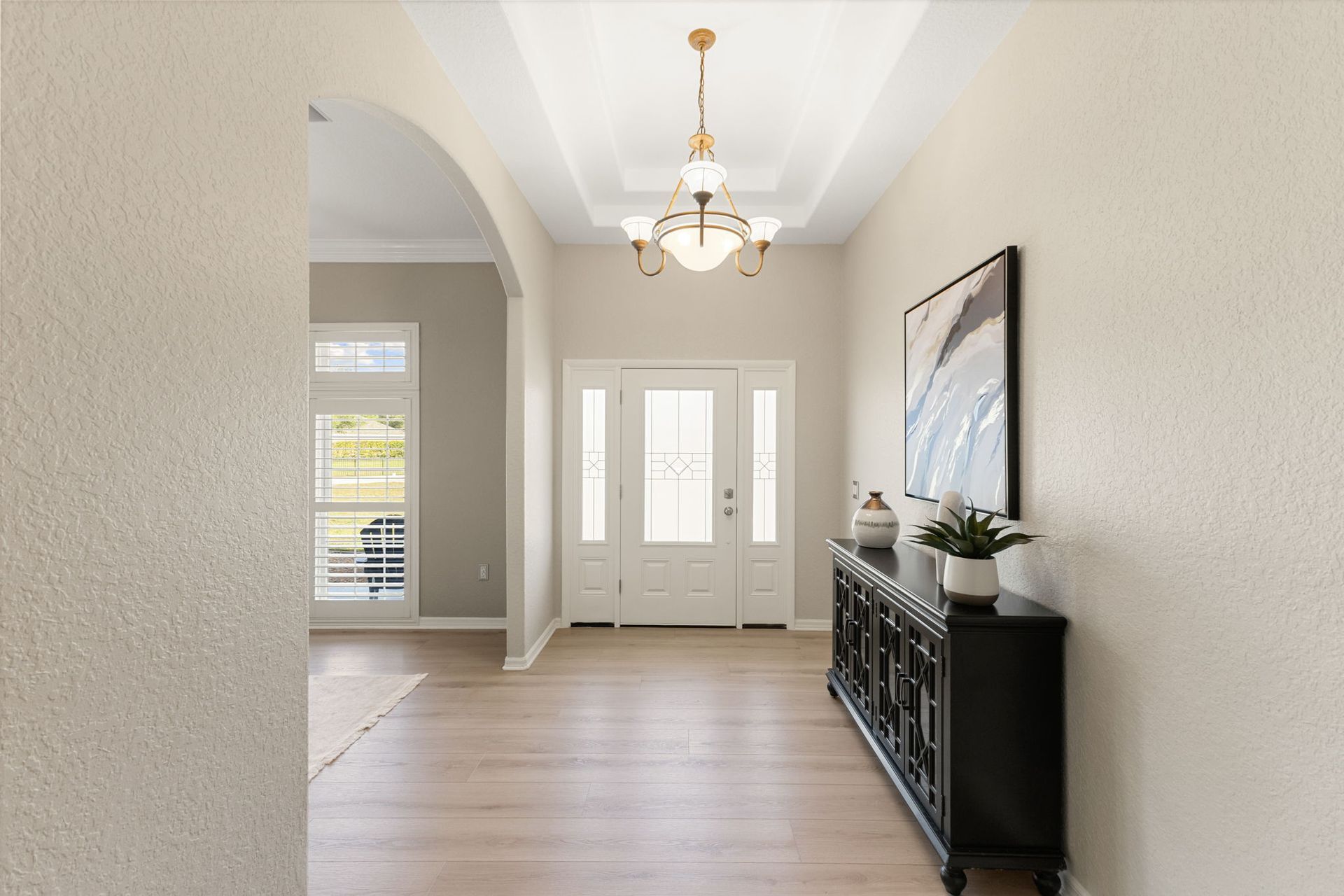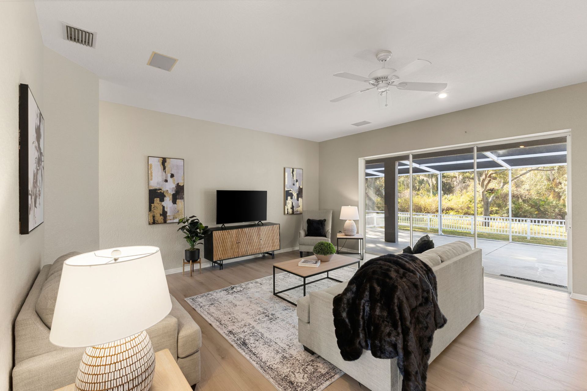 privacy, comfort, and equestrian living. Step inside to serene views of the backyard, framed by mature trees and the soothing sound of the pond’s fountain. Natural light fills the home, highlighting plantation shutters and tall knockdown ceilings throughout.