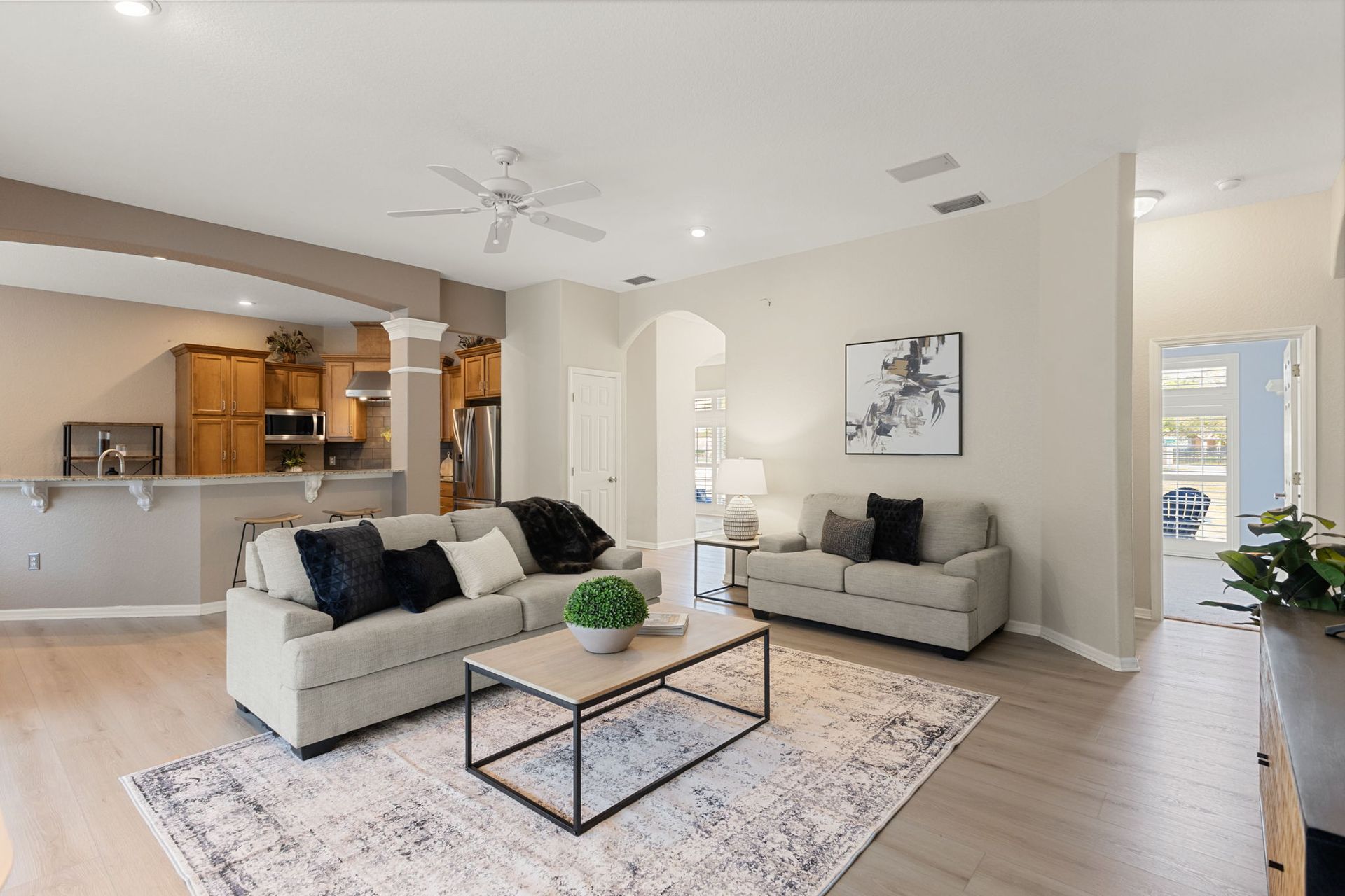 Brand-new luxury vinyl plank flooring enhances the main living areas, while the kitchen features granite countertops, stainless steel appliances, and overlooks the living room—making it ideal for